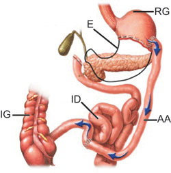 de intestino (AA), "puenteando" la mayor parte del intestino delgado